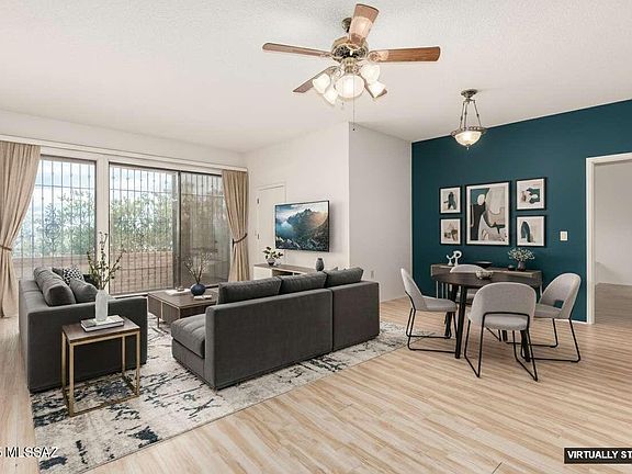 A light, bright end-unit townhome in a friendly 55+ community with amenities that make every day feel like vacation. Perched on a high lot with beautiful views of the Tucson Mountains, this home offers a wonderfully spacious Great Room with plenty of room for both living & dining. Lg sliding glass doors bring in natural light and open to a private outdoor area--perfect for enjoying Arizona sunsets. The galley kitchen features ample cabinet space & convenient pass-through to the dining area. The primary bedroom has a charming window seat, ideal for reading, or taking in peaceful morning light. As an end unit, you'll appreciate extra privacy. The community is packed w/lifestyle perks: pickleball courts, a refreshing pool & spa and a recreation center where neighbors become friends.