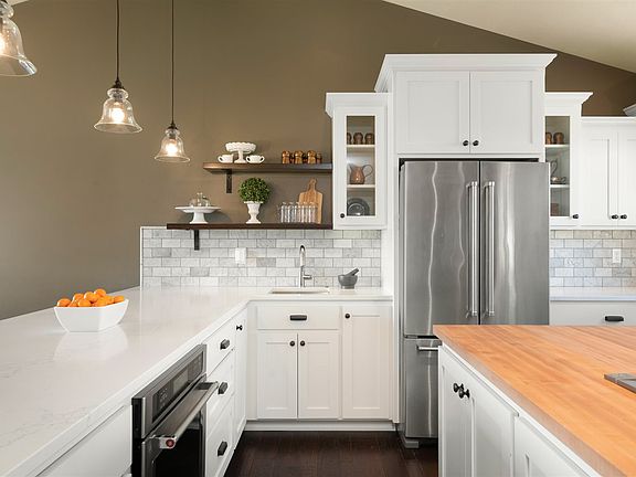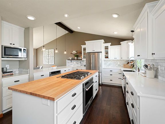 Mead school district hillside home w/ perfectly remodeled kitchen and new carpet. Beautifully landscaped. Vaulted ceilings and hardwood floors in dining + kitchen. Cook's dream kitchen includes large butcher block island with gas cooktop and oven along w/ separate oven and prep sink, SS appliances and marble backsplash. Living room with gas fireplace and built ins. Master bedroom with ensuite, 4 more bedrooms along with bonus space in 1 room. Unfinished bonus room in basement. Fully fenced back yard!