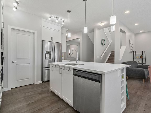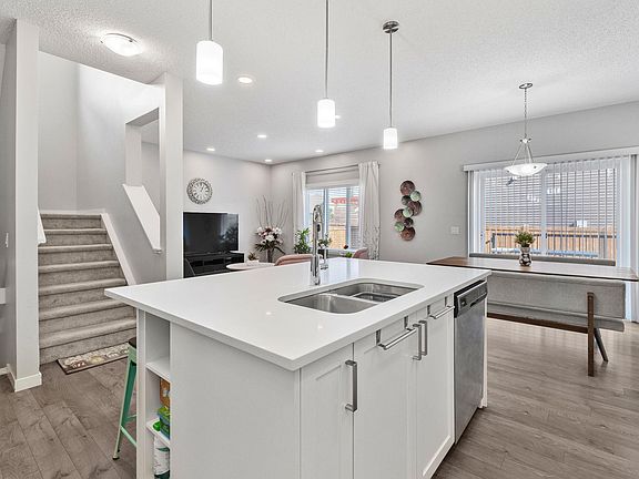 TURN KEY. INCREDIBLE VALUE. PRIME LOCATION. This beautifully maintained 2-Storey in Crystallina Nera West offers over 2300 Sq Ft. of living space on a quiet street, with the rare bonus of extra yard space and separation from neighbors—Not a zero lot line. The main floor features a bright Living Area and a Chef’s Kitchen with Quartz Countertops, Stainless Steel Appliances, a Built-In Gas Stove, Island, and Tile Backsplash, plus a Dining Space that opens to the Deck and Backyard—ideal for both entertaining and everyday living. Upstairs, Tall Vaulted Ceilings highlight the Bonus Room, create an awesome space for family time or quiet evenings. Four Bedrooms include a spacious Primary Bedroom with Walk-In Closet and 5-Piece Ensuite, while a Full Shared Bath and Laundry complete the level. The Unfinished Basement offers endless potential. With Central A/C, Deck, Double Attached Garage, and quick access to Parks, Schools, Shopping, and the Henday, this home is perfect for upsizing families. WELCOME HOME
