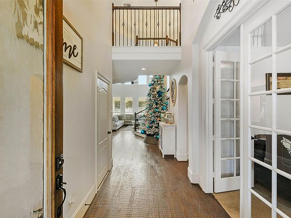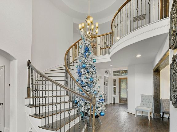 Experience refined living in this exceptional Westin-built residence, where a dramatic tiered rotunda sets the tone for elegance throughout. Hand-scraped wood floors & plantation shutters elevate every space.The soaring two-story limestone & brick fireplace—paired w/a custom hand-scraped mantle-creates a breathtaking focal point in the den,complemented by bespoke built-ins and surround sound.Home features Generac generator, new fence w/two gates, upstairs outside a/c unit replaced in '22 & downstairs outside a/c unit replaced in '25.Dining room impresses w/architectural hand-scraped beams, while the gameroom features a sophisticated built-in bar with mercury-glass tile.Travertine floors span the kitchen,breakfast area,half bath,utility, & primary suite for a timeless finish.A generous backyard offers the ideal canvas for a resort-style pool and outdoor kitchen.Situated within the only gated enclave of Eagle Springs, this home delivers unmatched privacy,craftsmanship,and luxury.