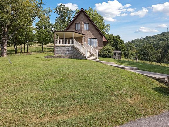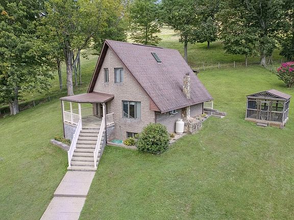 Tucked away on a serene mountain setting, this A-frame beauty offers the perfect blend of rustic charm and modern comfort. With a metal-roofed two-car garage plus a third bay for your mower and gear, practicality meets peace of mind. Step inside to a spacious living room adorned with rich wood flooring and a striking wood beam that adds character and warmth. The eat-in kitchen features granite countertops and a convenient pass-through bar to the living room—ideal for entertaining or cozy mornings with coffee. The main level boasts a generous bathroom with a jetted tub for ultimate relaxation. Upstairs, you'll find two inviting bedrooms—one with skylights that bring in natural light—and a sitting area that opens to a covered rear deck, perfect for quiet evenings or mountain stargazing. Downstairs, the finished basement offers a large den with a gas log fireplace, wormy chestnut wood, an additional bedroom, a full bath with laundry, and a separate exterior entrance. Outside, enjoy the screened-in gazebo complete with ceiling fan and plug-ins, or take in the mountain views from the covered front porch. Privacy, comfort, and charm—all wrapped into one unforgettable home.