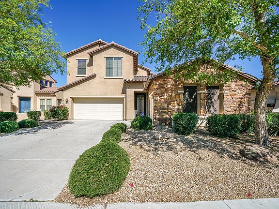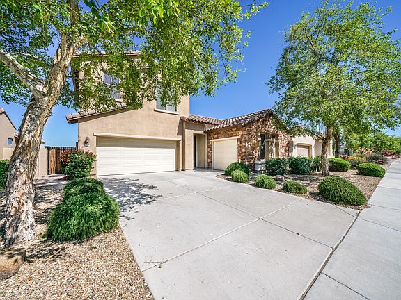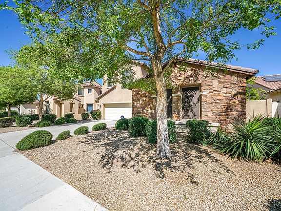 You must see this fantastic, move in ready 5BR/3BA pool home on a private lot with NO NEIGHBORS BEHIND. This immaculately maintained home offers a separate den/office, formal dining area, living room, an open kitchen with breakfast area and adjoining family room complete with an elegant fireplace and built in wood entertainment center. The kitchen boasts granite counters, kitchen island, SS appliances, dual ovens, and upgraded cabinets. This popular floor plan includes 1 BR and full BA down and a large family room/media room upstairs. The upstairs master is complete with dual walk-in closets, dual sink vanities, separate tub/shower, and private toilet room. Additional features include an air-conditioned 3rd bay garage, ceiling fans, security system and a Kinetico soft water system. Relax outside and enjoy your own private backyard oasis with a covered patio, sparkling, heated Pebble-Tec pool, and beautiful desert landscaping. To show is to sell.