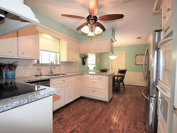 A TRUE GEM! Gorgeous Single Story-4 Bdrm/2.5 Bth Home w/Oversized 2.5-Car Detached Garage on 1/4+ acre lot! Many recent upgrades incl: 2018 Roof; 2017 A/C; and more! Inviting covered front patio, lush landscaping & mature trees. Travertine Stone tile in Entry. Spacious Den features raised tray ceiling, gas/wood burning fireplace & built-ins. Frml Dining can easily accommodate a long table--great for entertaining! Frml Living Room (or Study??you decide). Kitchen w/double ovens, granite counters, garbage disposal & window over single bowl undermount sink w/sprayer faucet. Hardwood flooring in the kitchen/breakfast room. Huge Master Suite w/built-ins & updated Master Bath w/Carrara Quartz Counter, Dual Sinks, Carrara Marble Tile & 2 walk-in closets. Bath 2 w/Granite Counter & 2 undermount sinks. Updated 1/2 Bath w/Granite Counter located off laundry room. Includes: Sprinklers*Fans*Plantation Shutters & Blinds*Grill*Kitchen Refrigerator & Washer/Dryer. NEVER FLOODED. Greenbelt behind home.