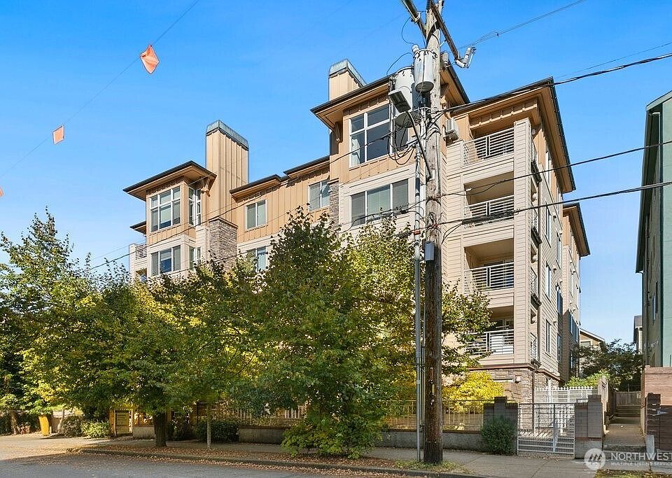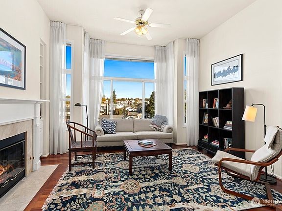 The ultimate combination of convenience, design, and comfort! Sun-drenched top floor condo with vaulted ceilings and a smart, open layout. Situated on the peaceful side of the building. Modern kitchen features sleek silestone counters and stainless appliances. Generous primary suite with walk-in closet and luxurious five-piece bath, plus a second bedroom with private en-suite. Thoughtful built-ins, hardwood floors, and a cozy gas fireplace add character. Dues cover high-speed internet and cable. With an outstanding walk score, enjoy effortless access to all of downtown Ballard’s shops, dining, and nightlife!