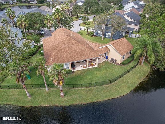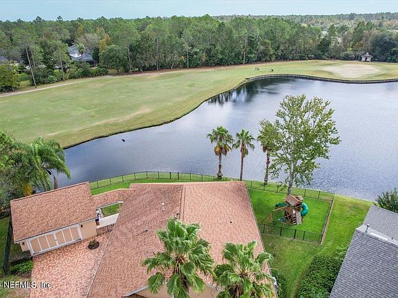 WHAT.A.VIEW! Discover your oasis in this 4-bed, 3.5-bath home situated on a spacious .45-acre cul-de-sac lot WITH water/golf views that rival all others in SJGCC. Step inside to an inviting open layout featuring a formal dining room, perfect for gatherings which flows right into the large eat-in kitchen with breakfast bar. Newer stainless appliances, beautiful cabinets & granite counters finish the space which opens seamlessly into the family room, creating an ideal space for entertaining. Need a quiet workspace? A private office with French doors offers the perfect solution. Beautiful plantation shutters & architectural details round out some of the nice finishes in this home. The main-floor primary suite is a luxurious retreat, showcasing a stylish barn door, his/hers closets, & an ensuite complete with separate vanities, a soaking tub, & walk-in shower. Two additional large bedrooms downstairs share an updated bath, making this home perfect for families or guests. Upstairs, you'll find a versatile loft that can serve as a fourth bedroom complete with ample storage and its own full bath. The fully fenced backyard is an outdoor paradise, offering stunning views of the water and the 4th fairway. There's plenty of space to add an outdoor kitchen to complete the outdoor living lifestyle. Additional highlights include a beautiful paver driveway with detached 2 car garage with an epoxied floor and a porte-cochère, providing both convenience and charm to this amazing home. New roof in 2019, new tankless water heater in 2021, new dishwasher and fridge in 2023. Don't miss the opportunity to make this exceptional property your forever home!