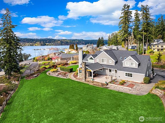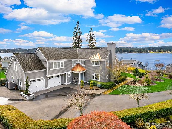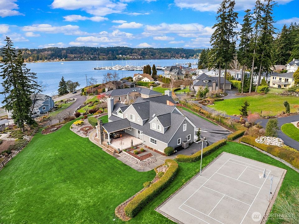 Created to highlight spectacular water & mountain views, this in town Poulsbo gem is a sophisticated spin on everything we treasure here in the PNW. Light filled & boasting countless, custom spaces for relaxation & entertainment, this home has vistas from almost every room. Designed for function & style, the kitchen opens to an attractive den with soaring ceilings, a formal dining area & an enclosed, fireside patio. A luxe primary suite leaves nothing to be desired. The spacious bonus room could be used as part of a guest wing, a home gym or a media room. The generous lot (just shy of an acre) features a water facing patio, gorgeous, mature landscaping & a coveted pickleball/sports court. Close to 3 marinas, Poulsbo amenities, & ferries.