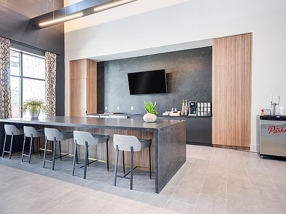 - Exterior features: Athletic Club with Group Fitness Studio, Conference Room, Dual Tone Kitchen Cabinets with Soft Close Feature, Exterior Type: Conventional, Frameless Beveled Edged Vanity Mirrors, Gourmet Kitchens with Quartz Countertops, Grab and Go Resident Market, Hospitality Bar with Fresh Brewed Coffee, Marble Kitchen Backsplash, Outdoor Entertainment Lounges, Oversized Single Basin Kitchen Sink, Package Receiving, Pet Park, Premium LVT Flooring in Living Areas, Stainless Steel and Energy-Efficient Appliances, TV Lounge, Undercabinet Kitchen Lighting
