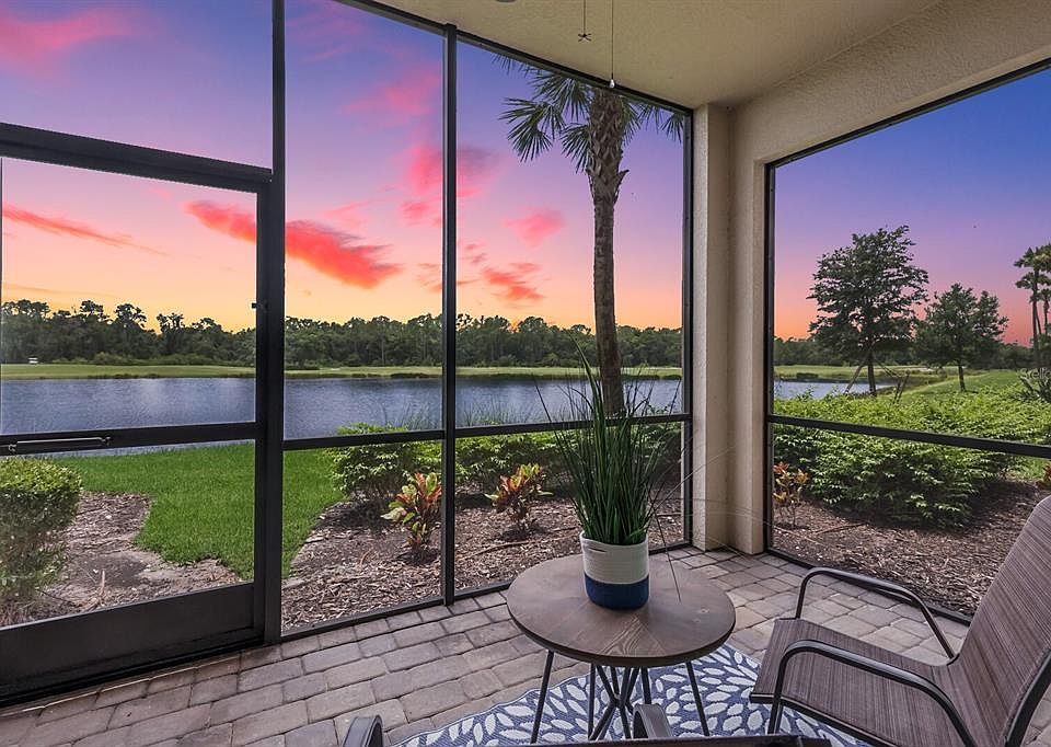 RARELY AVAILABLE FIRST-FLOOR, GOLF BUNDLED, BIRKDALE MODEL (the LARGER of the two 2-bedroom floorplans with the living space in the rear of the home where the VIEW is) features NO CARPET and is offered FURNISHED/TURNKEY. Your FIRST-FLOOR LOCATION also provides the convenience of avoiding the elevator and is perfect for pet owners. Step inside to discover a thoughtfully designed interior where the kitchen seamlessly blends with the spacious great room, creating an inviting atmosphere for gatherings with friends and family. Lakewood National offers an unparalleled lifestyle enriched by INCLUDED GOLF MEMBERSHIP BENEFITS. This beautifully maintained condo features stunning panoramic views that showcase the beauty of Lakewood National—serene water vistas to the south, captivating SUNSETS to the west, and a double-sided screened lanai offering a vantage point of mid-fairway of the 16th hole on the Piper Golf Course. The kitchen features an oversized quartz island, stainless steel appliances, chic shaker wood cabinets, and cool-toned quartz countertops, providing both style and functionality. Recent upgrades include: NEW A/C 2022, & NEW FLOORING in both bedrooms 2024. This meticulously maintained condo includes elegant crown molding, a primary suite complete with an ensuite bathroom, featuring a luxurious walk-in shower, a second bedroom providing versatile space for guests or office, in-unit washer and dryer, and an assigned storage closet. Convenience is paramount with covered designated carport parking, and a community satellite pool just steps away. The allure of Lakewood National extends far beyond the confines of your condo. As part of the golf bundled package, residents enjoy exclusive access to *2 renowned Arnold Palmer-designed golf courses, allowing golf enthusiasts to indulge in their passion at their leisure and resort-style amenities including: *24-hour gated security with roaming patrol, *State-of-the-art fitness center with 24-hour access, *Onsite fitness director and a TPI certified personal trainer, *Full calendar of fitness classes, *8 lighted Har-Tru tennis courts, *4 pickleball courts, *2 Har-Tru bocce courts, *Full-service salon/spa, *Resort-style lagoon pool with waterfall features, hot tub, & lap pool, *Enjoy a casual meal or snack poolside at the Tiki Bar or choose the full-service on-site dining experience at Deke’s Grill or the Palmer Room located inside the newly finished clubhouse. Located near Waterside, University Town Center, and the pristine West Coast beaches, Lakewood National offers the ultimate Florida lifestyle. Don't miss your chance to experience luxury condo living with GOLF MEMBERSHIP INCLUDED.