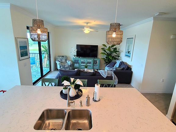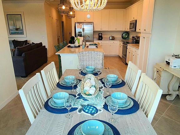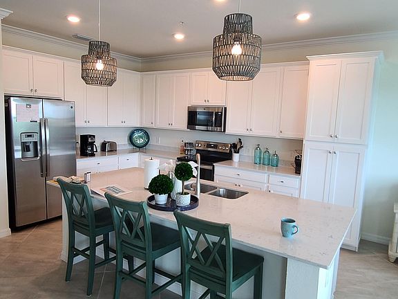 What a view of the lake and golf course from the great room! It's furnished with an elegant, three seat sofa and two seat loveseat for you and your family to rest or watch your favorite TV show or movie on the large 65" Smart TV. It also offers a comfortable seascape chair to enjoy while you're reading your favorite book. The stunning, expansive kitchen has modern, white cabinets and a large white quartz island, with lots of space to enjoy a meal or entertain. You will love cooking in the kitchen as it is equipped with everything you need such as silverware, dishes, pots and pans, bakeware, and cooking utensils.