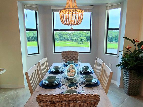 The dining room has a bay window which offers beautiful lake and golf course views and has an extra spacious desk for all your work needs.