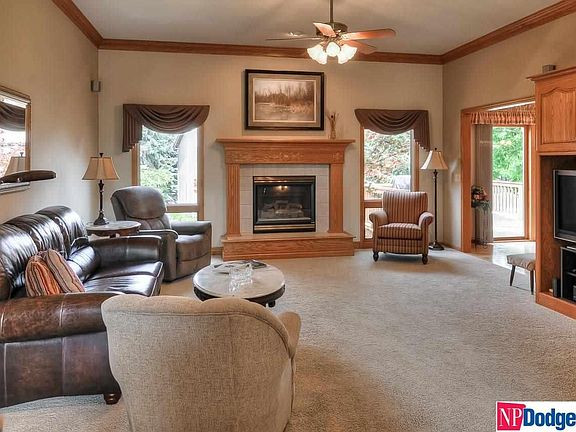 Move right into this beautifully maintained ranch home in Cinnamon Creek! Beautiful, lush landscaping and mature trees. With 3 bedrooms, 3 bathrooms, spacious living room with direct vent fireplace flanked by large windows, extensive use of crown molding and soaring ceilings. Beautiful kitchen featuring stainless appliances, hardwood floors, expansive windows walking out to deck overlooking the treed backyard. Large primary suite featuring a huge master closet, whirlpool tub. Walkout basement features family room with second fireplace, bedroom, and bath. Plenty of storage available! Main floor laundry room, 3 car garage and more. This home is sure to check all of your boxes. Walking distance to Millard West HS, Russell MS, and even Wheeler Elementary, shopping, restaurants and MORE! Newer roof!