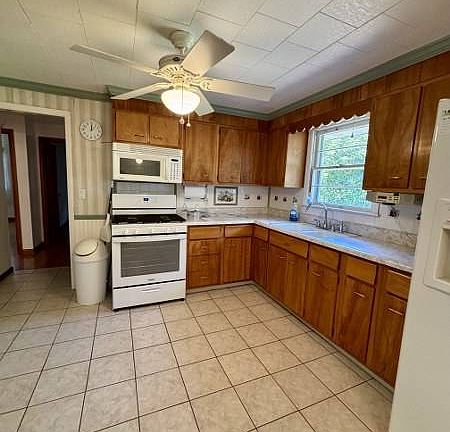 Charming and well-maintained, this 2-bedroom, 1-bathroom home built in the 1970s offers comfort and convenience with several modern updates. Step inside to find hardwood and ceramic tile flooring, a bright and airy sunroom, and ceiling fans in every room. The kitchen comes equipped with a gas range (new in 2023), microwave, and refrigerator, making it move-in ready. Recent improvements include a new roof (2023), water heater (2023), and a gas furnace cleaned in 2024. Central air provides year-round comfort, and the attached 1-car garage adds everyday practicality. Outside, enjoy a welcoming front deck and two handy outbuildings for storage or hobbies. This property is a wonderful blend of classic charm and modern updates-ready to welcome its next owner!