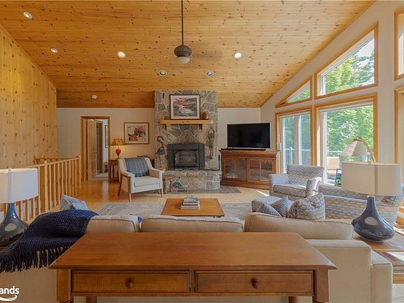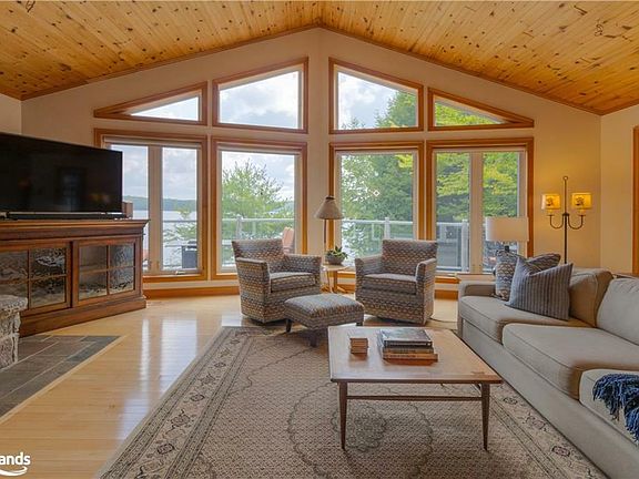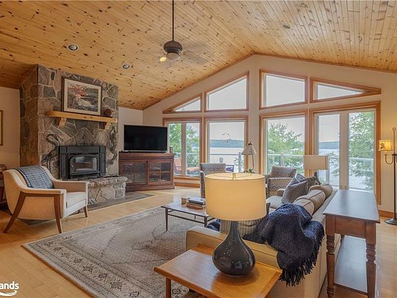 Luxury cottage or home on the shores of Gull Lake, this incredible property has over 3,500 SF of living space, 4 bedrooms, 3 baths, & is the ideal getaway for those looking to escape the city & enjoy some time in cottage country. Enter through the custom stained glass front door & into the open concept principal rooms. The living area features breathtaking views through floor to ceiling windows & a wood burning stone fireplace. Walk straight through into the kitchen & dining area, with a large bay window, wood cupboards with several stained-glass doors, granite countertops & stainless steel appliances. The fully winterized sunroom has a propane stove, easy access to the principal rooms & walkouts to the front deck & lakeside deck. Enjoy dining al fresco, a coffee or just the views on the full length lakefront deck. The main floor primary suite was finished with comfort in mind, featuring a walkout to the lakefront deck, 4-pc ensuite & a walk-in closet with private laundry. Completing the main level is a 2nd bedroom & an office, both with bay windows overlooking the gardens, & a 4-pc bath. The lower level sits partially above grade with 2 walkouts to the lakefront gardens & patio. The staircase down brings you into a large & bright rec room with propane fireplace, the perfect place for games or movies. This level has 2 bedrooms on the lakeside, one that’s currently used as a gym, along with an enclosed walk through with a murphy bed, perfect for extra guests. The 3-pc bath, sauna & lower-level entrance are perfect for those coming in & out from the lake, with easy access from the patio. This cottage sits on almost an acre with 157’ of clean, sandy frontage on the lake, shallow entry & eastern exposure. The oversized garage features space for 2 cars & a boat plus there is a spacious garden shed. Gull is a premium lake, sought after for being both a clean & less than 2 hours from the GTA. Enjoy incredible big lake boating and access down the river right into Minden.