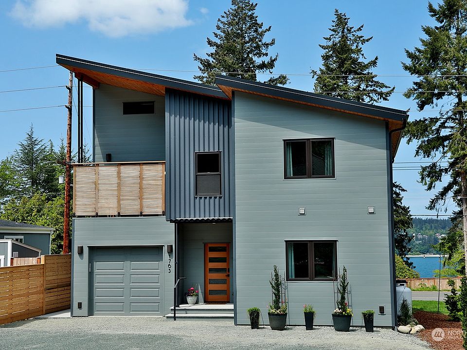 Investment opportunity meets sophisticated, modern architecture in this Holmes Harbor view property. Ideal for relaxed living and flexible living options, with interior spaces that include lock-off option for Air BNB on entry level. Two bedrooms, 2.5 baths, 2 kitchens, 2 fireplaces, 2 laundry rooms + 3rd floor loft. Open spaces, cathedral ceilings, efficient kitchen design, stainless counter tops. On demand water heaters, 1 car garage and 4-car parking in driveway. Metal clad exterior, custom Danish design deck railings, atrium stairwell access to 2nd and 3rd levels. Enjoy year round, use as vacation home, or rent both separate levels. Close to Freeland amenities and the beach park at Holmes Harbor.