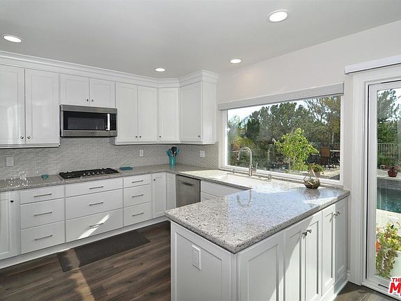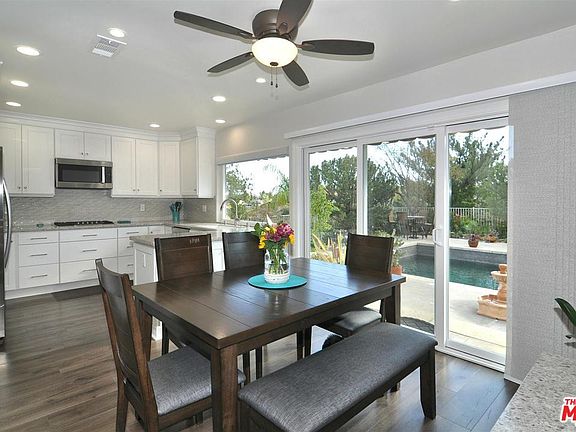 Beautifully remodeled tri-level home, complete with 2700 sq. ft of living space, 3 car garage, pool, perfectly manicured front and back gardens, new kitchen and much more...The house receives lots of natural light, which comes in through the double-paned windows and sliding doors, and has a warm and inviting floor plan. The kitchen has new stainless steel appliances, cabinets with roll-out drawers, recessed LED lighting and automated open-close window coverings. The dining and living rooms are both spacious with gas fireplaces. The backyard is an entertainer's paradise highlighted by the pebble-tech surfaced pool, which has a colored light wheel and was converted to a "shallow pool." The large patio area has a patio cover and awning, making it a great place for table and chairs. There are beautiful succulents surrounding the property, providing a water friendly landscape, and also are illuminated by outside lighting.