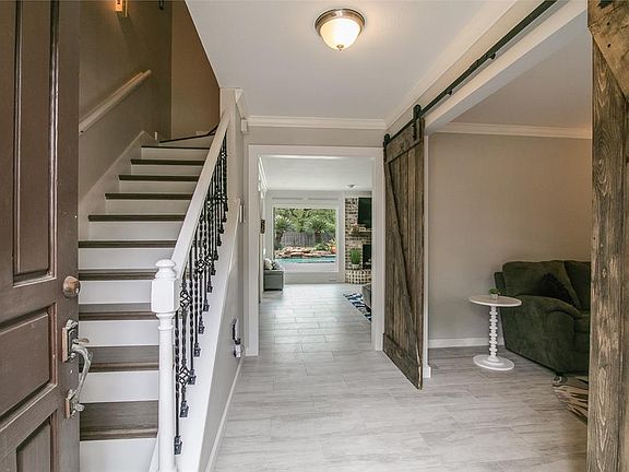 Updated home in Terranova West! Sparkling in-ground saltwater pool/spa on large lot! Large detached garage and immaculate lawn. Recent paint, upgraded low E windows, and 2 blinds. Barn doors and crown moulding frame the formal dining area and laminate flooring was added to the upstairs game room, a full bath with granite counters and to the staircase with wrought iron trim. Large den with gas log fireplace and butlers pantry/dry bar. Kitchen features a farm sink and soft close cabinetry, recessed lighting, stainless appliances, quartz counters with tile backsplash and sunny breakfast room with bay window. Large Owners retreat with gorgeous private bath featuring granite counters, Jacuzzi tub, separate shower and two walk in closets. Huge fenced backyard with large covered patio and vegetation barrier to back neighbors. Safety fencing around the pool area. Located within walking distance of the neighborhood clubhouse, pool and tennis courts. Home has never flooded. Call today!