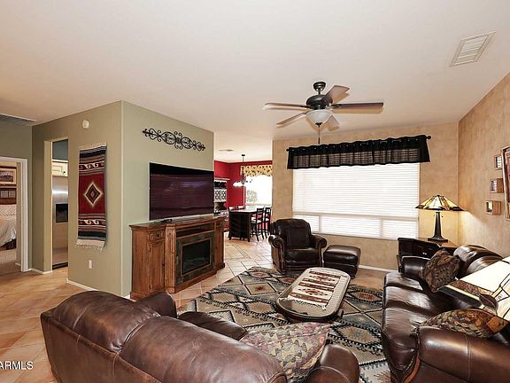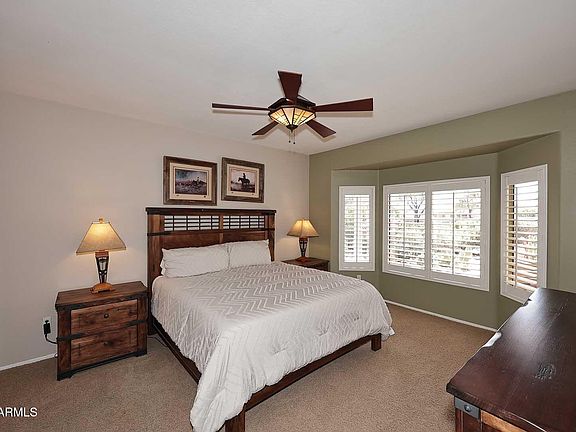 Welcome home to the prestigious Sun City Grand community in Suprise! This amazing home features 3 bedrooms, 2 baths, 1616 SF, open floorplan, tall ceilings & windows w/plantation shutters T/O! Charming kitchen features; black granite counters, stainless steel appliances, breakfast bar for added seating & lots of cabinets with pull-out drawers! Spacious primary suite w/spa-like primary bath & walk-in closet. Secondary bedrooms separate from primary for added privacy. 3rd bedroom includes built-in book shelves & desk. Covered patio in backyard w/flagstone, built-in BBQ, waterfall feature and extended seating area for the fire pit! 2-car garage includes attached storage cabinets & work bench. Great community amenities, close to lots of restaurants, shopping and so much more!