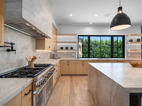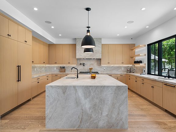 Welcome to this exceptional newer construction, gated estate situated South of the Boulevard in the heart of Encino. As you enter the home you will be greeted to a light and bright open floor plan that boasts high ceilings throughout. A culinary enthusiast's dream, the designer kitchen is outfitted with high-end Thermador appliances, a massive waterfall island, walk-in pantry and breakfast nook. The kitchen seamlessly flows into the formal dining room and spacious family room, where three oversized sliding glass doors flood the space with natural light and open to extend your living space outside. Rounding out the main level are a formal living room, state-of-the-art home theater, ensuite bedroom, mudroom and power bathroom. Ascend the floating staircase to find four generously sized ensuite bedrooms and a laundry room. The lavish primary suite features a custom walk-in closet and sumptuous bathroom that consists of a soaking tub, large rainfall shower, smart toilet, double vanity and separate makeup vanity. Surrounded by mature privacy hedges, the serene backyard retreat is an entertainer's paradise. Take a refreshing dip in the pool/spa or enjoy an al fresco meal under the covered patio. There's also an outdoor kitchen with bar seating, built-in firepit, low maintenance artificial turf yard and inviting side courtyard. The detached pool house has its own bathroom, making it the perfect space for an office, gym or guest suite. Additional amenities include a Control-4 smart home system, built-in speakers, security system and a two car garage. This large corner lot property is ideally located on a quiet cul-de-sac within an excellent school district and just a short walk from superb shopping and dining options found along Ventura Boulevard.
