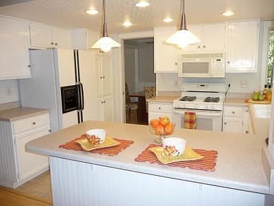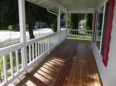Fabulous corner lot w/private fenced yard. Gorgeous covered wrap around Ironwood front porch. Large rear deck + dual patios. Charming white picket fence & paver entrance. Interior updated w/bamboo floors & newer windows. Dining Rm has lg picture window & bead board wainscoting. Bright spacious kitchen w/eating bar & garden window. Gas range, fridge & W/D included. Family room off kitch w/desk cubby & sliders to patio. Master Suite w/dual vanities & walk-in closet. RV pkg, shed & composting bin.