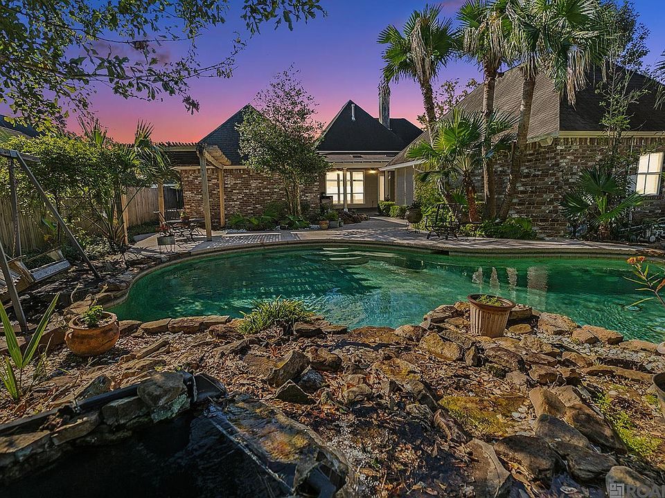 Welcome to your dream home—a beautifully appointed residence nestled on a large landscaped corner lot in one of the area’s most desirable and established neighborhoods. This elegant 5-bedroom, 3-bathroom home truly has something for everyone, offering a perfect blend of luxury, comfort, and everyday functionality. Step inside to soaring 12+ foot ceilings and a spacious open floor plan that seamlessly connects the living, dining, and kitchen areas. The formal dining room exudes sophistication with its dramatic arched windows, soaring ceilings, and statement chandelier—perfect for hosting memorable gatherings. The heart of the home is the kitchen featuring rich cypress cabinetry, new granite countertops, a gas cooktop, and a generous pantry. The adjoining keeping room, complete with built-ins and a cozy fireplace, creates an inviting space for family and friends to gather. A large laundry room with a sink is conveniently located near the bedrooms, adding to the home’s thoughtful design. Step outside to your private backyard oasis—complete with a stunning gunite pool with a waterfall feature, lush tropical landscaping, and a spacious covered patio with a fully equipped outdoor kitchen. Whether relaxing under the palms or entertaining guests poolside, this space is pure paradise. Additional highlights include an enclosed garage with ample storage, a workshop area, and a boat port for extra convenience. This home offers refined Southern charm, abundant space, and modern comfort—all set within a quiet, well-loved neighborhood that feels like home from the moment you enter.