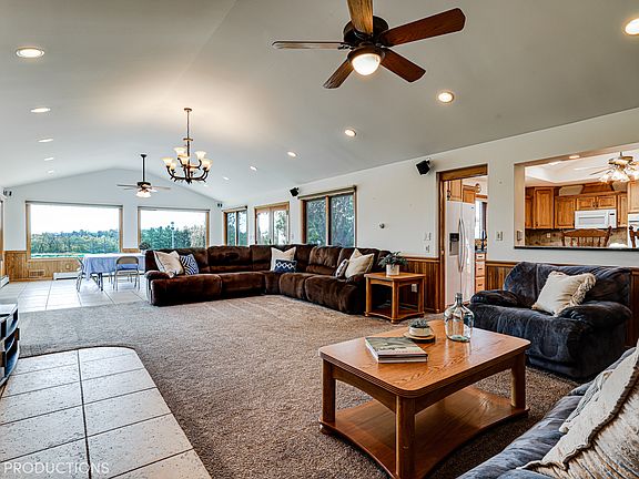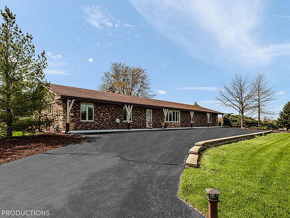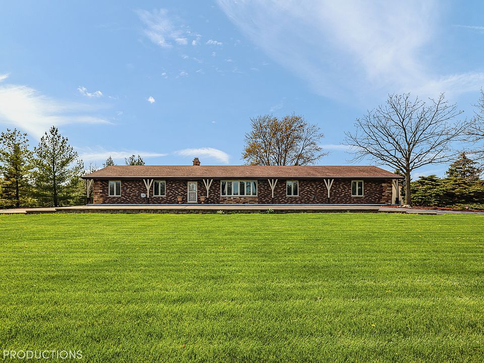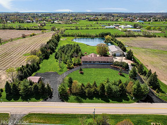 BREATHTAKING VIEWS and gorgerous all brick ranch home situated on 5 acres with your very own 1 acre pond! Home features 5 beds, 3.5 baths, full finished basement with bar area, rec room & exterior access to the garage. Versatile, light and bright great room that features more stunning views, a beautiful stone fireplace and french doors that lead outside to the paver patio. The fabulous outdoor amenities include an oversized paver patio, a fully stocked pond with pier & sand beach area, heated pole barn, and 2 additional outdoor storage sheds. The pole barn (70x40) features its own bathroom, concrete floors, upstairs storage space & 2 overhead doors. This is the perfect country setting for entertaining, outdoors parties or just relaxing at home. **ALL New windows 2020, new ejector pump & hot water heater 2021, basement bathroom remodel 2020. Schedule your showing today!