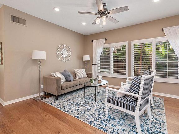 This Summerhill twin home is spacious, and thoughtfully updated. With four bedrooms, plus a loft there's plenty of space for all your needs. Enjoy hardwood floors in the living areas, and dual pane windows with plantation shutters throughout. Stay cool & efficient with air conditioning, a whole house fan, newer water heater, soft water system, and owned solar! The Kitchen has been tastefully updated with wood cabinetry, granite counters, stainless appliances and recessed lighting. It's adjacent to the large family room with fireplace and double doors to the patio. The wraparound patio features a recently added built-in barbecue center with beverage fridge, bar seating, and plenty of space for entertaining. The first level also features a large living room, dining room, one bedroom and a half bath. Note the custom wrought iron stair balusters and wood bannister, leading to an open loft addition upstairs- a perfect hang out space. Double doors lead to the primary suite with vaulted ceiling, walk-in closet and en-suite bath, beautifully remodeled with classic white cabinets, granite counters and glass enclosed custom tile shower. The second bath upstairs is also redone with white cabinetry, granite countertop and custom tile shower surround. Two more bedrooms complete the second level. The two-car, attached garage has laundry facilities and an updated garage door. Ideally located in the heart of Encinitas, with convenient access to the shops and restaurants of the El Camino Real corridor, the 5 Freeway, and less than 4 miles to world-class surfing beaches. The home is just blocks from both Diegueno Middle and Flora Vista Elementary Schools and directly across from a greenbelt park, providing privacy and views of foliage from almost every window. Don't miss this move-in ready home!