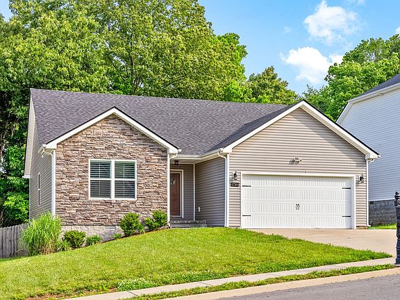 Desirable lot with treed backyard view that extends past the fence! Enjoy your morning coffee on the deck while listening to the beautiful sounds of nature and watch hummingbirds visit the feeder. Open floor plan home featuring upgraded quartz countertops, tile backsplash, under cabinet lighting, stainless appliances and added spacious pantry cabinet in kitchen, stone fireplace in living room, master suite has a large tiled walk in shower and oversized walk in closet, tile floors in kitchen and bathrooms, plantation shutter blinds throughout, flooring in attic for extra storage space, covered deck, rain gutter guards and privacy fenced back yard. Home has been freshly painted. Conveniently located close to Fort Campbell and I-24 and just minutes from the schools. This is a must see!