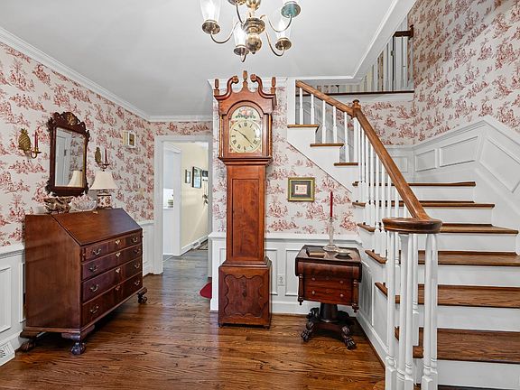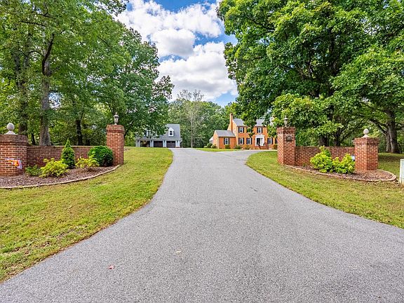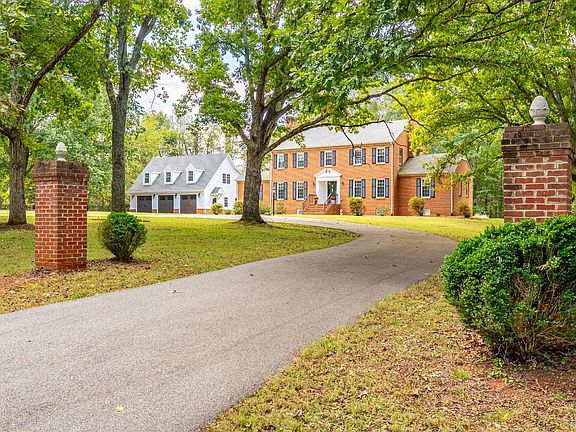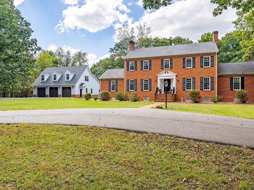 Immaculately maintained 1973 brick Georgian Revival set on 2 beautiful acres with timeless curb appeal and privacy. This 5-bedroom, 3-bath home features a formal foyer with designer wallpaper, elegant hardwoods, formal living room with fireplace, and formal dining room. The renovated kitchen opens to a cozy den with gas log fireplace, built-ins, and detailed moldings, plus a newly added 15x15 sunroom overlooking manicured grounds. Main-level bedroom with a full bath and laundry. Upstairs includes a spacious primary suite with en-suite bath, three additional bedrooms, and another full bath. Full unfinished basement offers abundant storage. Outdoor living includes a pergola, stone patio, brick walkways, and mature trees. Circular paved drive leads to a new 40x45 three-bay brick/ hardie plank garage/carriage house with second level. New windows, gutters, and well pump. Total recent upgrades of $286,000. Wow! Property backs to protected Monacan Indian Reserve ensuring lasting privacy.