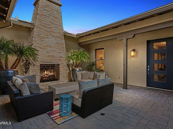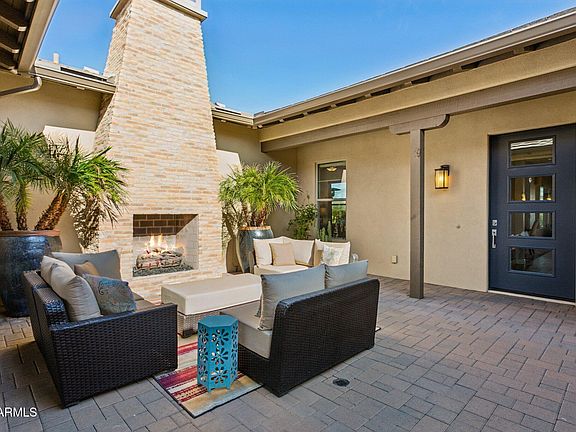 The thoughtfully designed 2,681-square-foot floor plan encompasses 3 bedrooms, 3.5 bathrooms, and a 3 car garage, harmoniously blending sophistication with comfort. A welcoming courtyard entry featuring an inviting fireplace sets the stage for the exceptional living spaces within. The versatile casita provides an ideal setting for a home office or guest quarters, while a refined den with French doors overlooks the tranquil courtyard. Premium wood-look tile flooring flows throughout, offering both elegance and practicality.