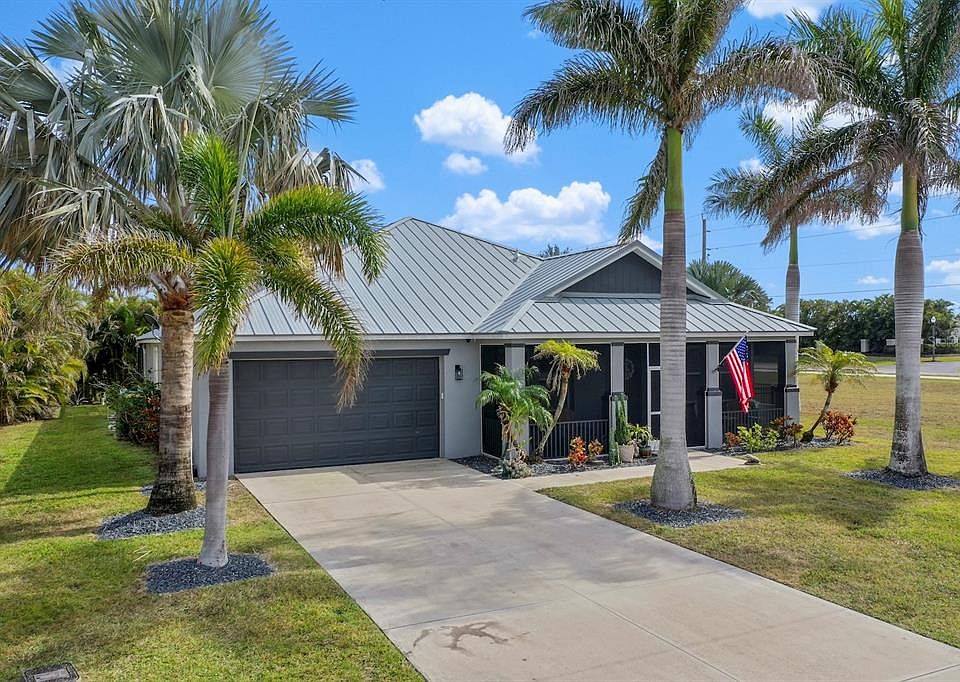 NO FLOOD INSURANCE REQUIRED! This spacious four-bedroom home in Burnt Store Lakes offers exceptional value, combining a prime location with impressive updates and features. Thoughtfully maintained and fully move-in ready, this property has everything you’ve been searching for. A brand-new metal roof (2023) and a screened front lanai invite you to relax and enjoy the stunning sunsets, while natural light fills every corner of this beautifully updated home. Inside, you’ll find tiled flooring throughout, an upgraded kitchen with newer appliances, and modernized bathrooms. The outdoor space is perfect for entertaining, featuring a fully fenced backyard with plenty of room for pets, a charming gazebo, and a deck area surrounding the sparkling pool. Recent upgrades include a new pool pump, a pool heater, and a new A/C system (2022). Plus, the irrigation system runs on a private well with a brand-new pump, offering significant savings on water costs. Burnt Store Lakes is a desirable, amenity-rich community with walking trails, a canoe/kayak launch, a park with a large pavilion, and regular community events—all included with low HOA fees. Conveniently located, this home provides easy access to Cape Coral and Downtown Punta Gorda. It’s also moments from Linkside Café and Burnt Store Country Club, which features a public 27-hole executive golf course. Just minutes away, you’ll find the Gulf Coast's largest deep-water marina, fishing charters, Cass Cay Restaurant, and more. This home offers unbeatable value, a fantastic location, and peace of mind with no flood insurance required. Don’t let this opportunity pass you by!