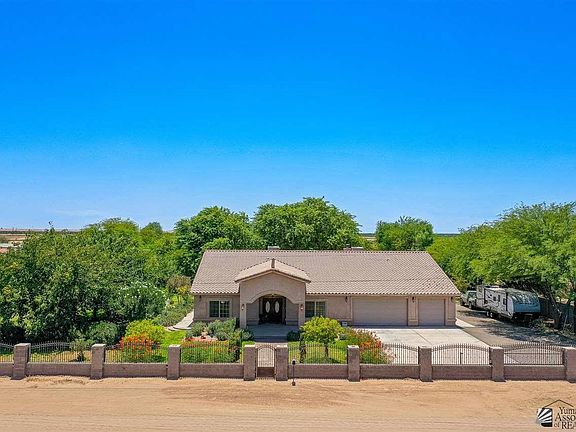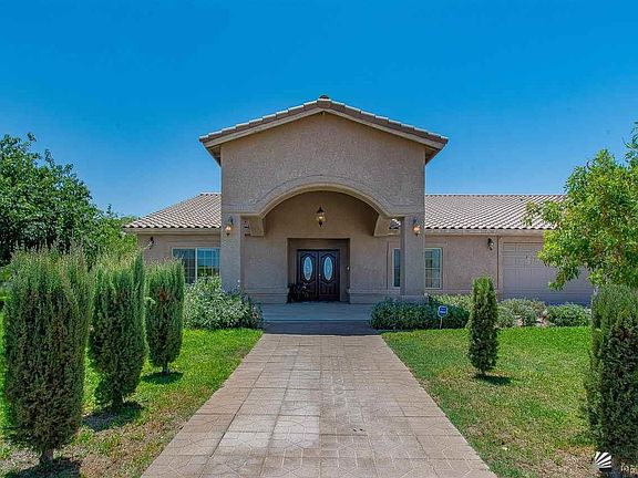 Country living at its best. This 4 BR 2690 sq ft home boasts an open/split floor plan, oversized primary BR with walk in closet & jetted tub, large bedrooms, spacious kitchen, & walk in pantry. Situated on 1.85 acres of lush green grass surrounded by fruit trees, date palms, & plenty of extra space for your animals. Exterior features a huge workshop/garage, extended patio, RV access, irrigation rights, and a block fence with wrought iron around the entire property. A must see!