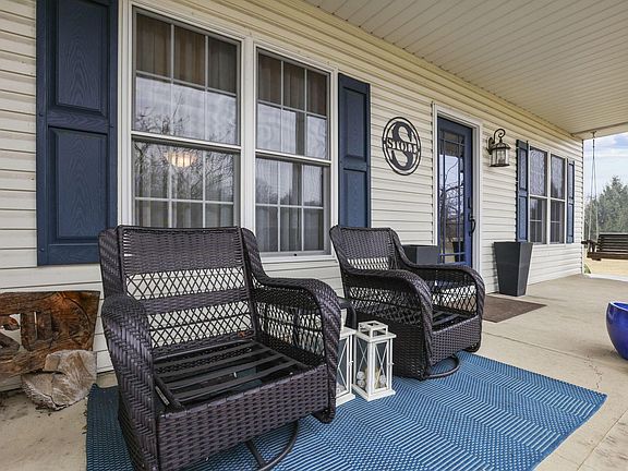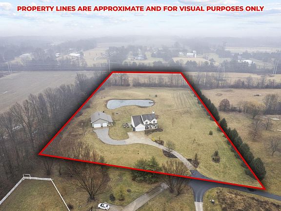 This distinguished 4 Bed, 2.5 Bath home sits off a private lane on nearly 10 acres of meticulously landscaped grounds, featuring a stocked pond w/fountain, covered front porch, rear paver patio w/FP, & concrete driveway. Offering 3,400+ sq. ft. of living space, 2-story Foyer, 1st-floor Den w/French doors, Laundry, GR w/fireplace, Formal DR, and a fully equipped Kitchen w/SS appl. & built-in desk/workstation. Upstairs, vaulted Owner Suite boasts a soaking Tub, Shower & walk-in closet. With recent upgrades exceeding $200,000, including a finished LL w/wet bar, geo-thermal heating, and a 36' x 45' pole barn. The pole barn offers a large covered patio side, 3 garage doors, storage loft, heated and so much more. This home is truly exceptional!