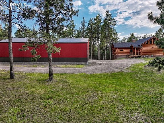 Architectural log masterpiece tucked in woods of Black Forest on 5 acres creating a retreat from the hustle and bustle of daily life. Exquisite custom crafted luxury home w/ amazing attention to detail, large diameter artesian quality Englemann Spruce logs that were hand scraped and hand peeled. New 40x72 metal building perfect for RV storage, workshop, a car collection or barn with electric, LED lighting, a 10x10 overhead door and a 12x14 RV overhead door. . No HOA or covenants. The acreage has been mitigated & is park like with towering Ponderosa Pines & lush green meadows w/ deer visiting often. Dramatic great room w/ 2-story ceilings, a wall of windows, structural log beamed ceilings with tongue and groove wood, a wood burning stove with river rock surround and a walk-out to the massive 55x10 well maintained deck which was engineered and prewired for a hot tub. Expansive main level primary suite with a walk-in closet and freshly remodeled bath with heated towel rack, leathered granite double vanity with copper pelted sinks, a standalone cedar tub, beautiful cabinetry slate floors, the shower has a heated floor and two shower heads including a rain shower head. Open concept kitchen with high end cabinetry, new appliances, stone counters and an island w/ cook-top and overhead lighting. Charming dining room that you will never want to leave surrounded on all sides by windows looking out to the surrounding forest and a walk-out to a private secondary deck. Upper level open loft w/ fantastic architecture and space for a variety of uses currently counted as a bedroom. Finished lower level with two additional bedrooms, a jack and jill bathroom, large family room, spacious laundry room and a walk-out. New class 4 impact resistant roof in 2022. Prewired for a generator. High quality radiant heat. This is the Colorado dream and the only log home on the market in Black Forest - see this gem quickly! Virtual tour and commercial marketing video available.