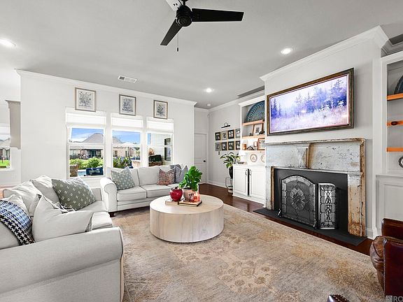 STUNNING home with panoramic views of the lake and pool as soon as you step foot through the front door! This beautiful 4 bedroom, and 4 full bathroom DREAM home has everything on your wish list and MORE! You will discover custom detailed finishes such as double crown molding, hand-scraped wood floors, built-in USB outlets in many rooms, an oversized kitchen island, upgraded lighting throughout, and a custom "built in" dog kennel that can also be used as additional storage space! This triple split floorplan offers spacious bedrooms with walk in closets and ceiling fans in every bedroom, built in cabinets/shelves throughout, gas log fireplace with TV connections above, large open living room and formal dining room, HUGE master bedroom suite complete with a GORGEOUS soaking tub and separate shower, double vanities that offer LOTS of upper and lower cabinet space and a large walk in closet with ample shelving. And that's just downstairs! Upstairs, you'll discover the private bonus room with attached full bathroom with custom closet design! Use it as an additional bedroom, a game room, even a home movie theatre! But wait, THERE'S MORE....Step outside to your very own outdoor oasis with an exquisite pool, custom woodburning fireplace, outdoor kitchen complete with an extended awning, and an incredible view of the pond with tranquil sounds of the fountain. Fish off the bank, or sail out on a pirogue, right in your own backyard! Two-car garage features epoxy flooring complete with charging station for electric vehicle. This home truly has it all and in flood zone X!! Make your appointment today to see this beauty in person before it's gone!