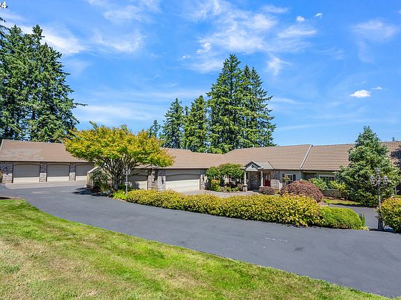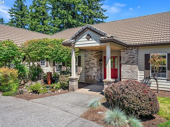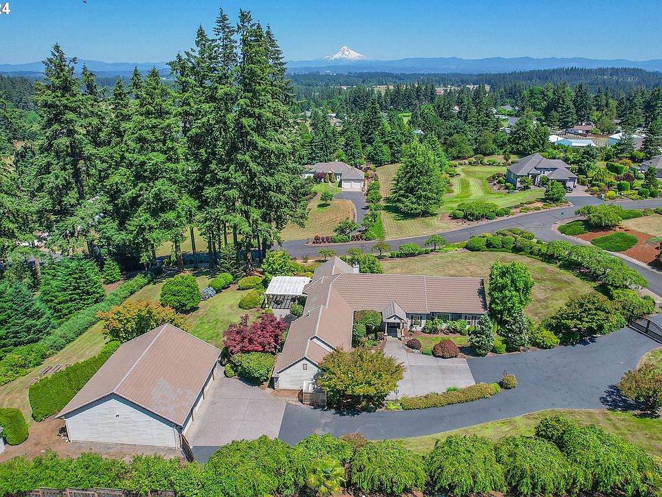 One level updated ranch on almost 2 acres with 6 garage bays and a private gate. Come and enjoy beautiful MT Hood views and stately grounds with 80 feet of a creek-like water feature flowing along the pathway to your large relaxing patio. There are great views from all areas of the property and gorgeous updated features inside, including an amazing gourmet kitchen with a 5.9ft x 8ft cook island, high-end cabinetry, double oven, wine fridge, lots of counter space, large walk-in pantry, double-sided fireplace and much more. The primary spa-like suite includes heated floors, standalone soaking tub, large roll-in double-headed shower with a bench, 2 sink areas and a smart toilet. Oversized 40ft x 37ft heated detached 3-bay garage comes complete with a full bath, 220v power and garage openers. The attached 3-car garage has a closed off 3rd bay with 4 French doors dividing it from the other 2 bays. An 8x6' greenhouse is included in the sale.