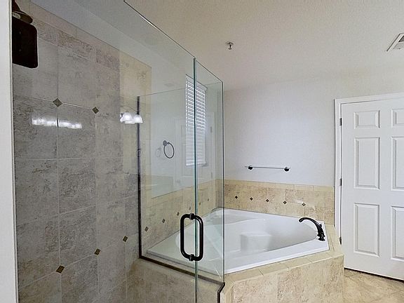 The Primary bedroom has an en-suite bathroom with an oversized soaking tub, a separate shower area, dual vanities, and a walk-in closet.