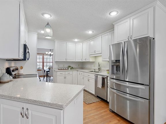Discover this updated 5-bedroom, 3-bathroom ranch nestled in a desirable north-side Iowa City neighborhood. The light-filled eat-in kitchen boasts white cabinets, quartz counters, stainless steel appliances, pendant and under-cabinet lighting, pull-out drawers, and a pantry. A bay window in the breakfast area adds charm, while the living/dining room features a vaulted ceiling. The main level family room, with a cozy brick wood-burning fireplace, offers backyard views and leads to a spacious screened porch, patio, and private fenced yard. Three main-level bedrooms include the primary suite with double closets and a double vanity bathroom. One bedroom doubles as a home office with built-in desk and shelving. The fully finished lower level features a large family rm and recreation room with a wet bar, two bedrooms with walk-in closets, and a full bathroom. Bonus: a second wood-burning fireplace, custom built-ins, and ample storage. Additional highlights: oak hardwood floors, Pella windows, ceiling fans, a new furnace/AC (2015), water softener, humidifier, and a 2-car garage with service door to backyd. Conveniently located near shopping, schools, Hickory Hill Park, and I-80, this home offers comfort, style, and unbeatable convenience.