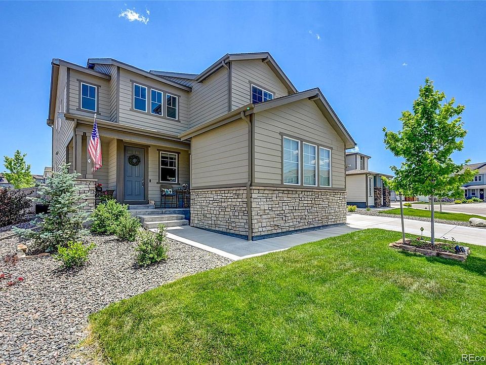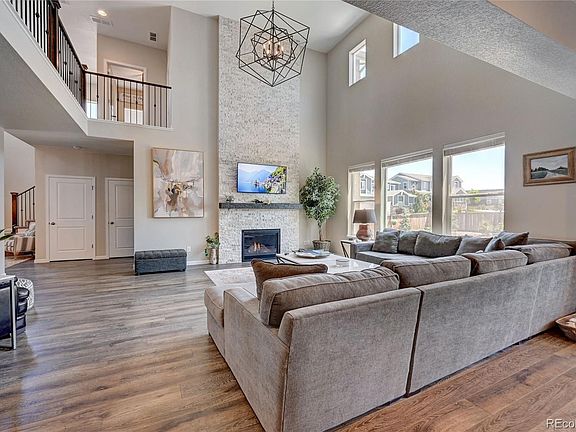 This elegant two story home built in 2019 by Taylor Morrison, featuring a grand two-story foyer with stunning open staircase, formal dining room and main floor guest bedroom with private en-suite bath. The spacious gathering room with two-story vaulted ceiling and cozy gas fire-place opens to a gourmet kitchen with espresso cabinets, granite countertops, stainless steel appliances including a gas cooktop, stainless hood and double ovens, massive walk in pantry and huge center island, and butlers pantry. The second story features open wrought iron railing, a loft, two secondary bedrooms with separate bathrooms, large laundry room, and a lovely master bedroom with 5 piece bathroom and walk in closet. Additional highlights include stone fireplace surround to the ceiling, extensive laminate wood flooring on the main level, 2-tone interior paint, partial basement with 9ft foundation walls, rollout shelves and trash bin in the kitchen, ceiling fans, central air conditioning. Additional interior features include a Custom reclaimed Wood mantle and designer lighting throughout the home, kitchen cabinet hardware, a utility sink in the laundry room and a cabinet in the art niche by main office/guest bedroom. One of the largest Lots in the community, Almost a quarter Acre of Beautiful backyard oasis with 15 trees and lots of plants. Extended Patio built sturdy with caissons and rebar to hold a hot tub and an option to add a covered patio. Driveway was extended for easy access to the third car garage and walk way from driveway to the backyard. 2 different Pools to choose from, Family pool area is less than a 2 min walk away, also in community is the adult lap pool, parks, trails and lots of Mountain and Hill views in this Beautiful Castle Oaks Estates of the Terrain Community. Situated in the Indigenous and rocky area of Castle Rock. Lots of shopping, including an outlet mall, and lots of great Restaurants.
