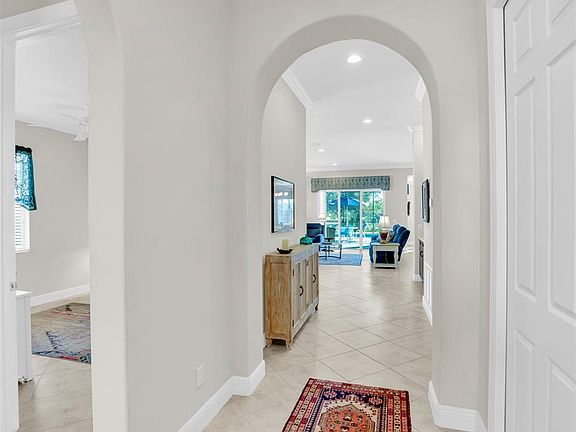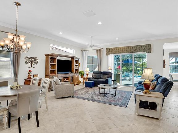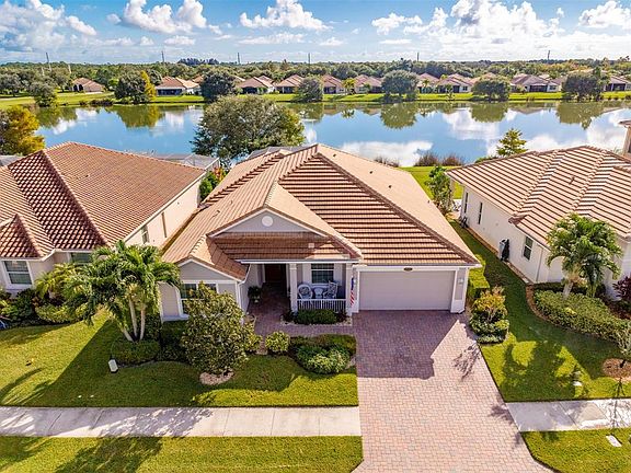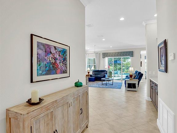 Sunrise kiss the living and kitchen areas with peaceful views of the lake and saltwater pool, where ducks and herons visit daily. A chef's kiss kitchen offers soft-close cabinetry, wall ovens, and a cozy coffee nook with front-row lake views. Tile on the diagonal flows throughout and, the dry bar and den are a bonus The spacious primary suite boasts a stunning vanity and features dual walk-in closets. Impact glass, 2023 exterior paint, 2024 AC and HWH. This home offers thoughtful accessibility features, including a garage ramp for easy entry and a spacious primary bath with a wheelchair-accessible shower. Controls at the shower entrance provide both safety and comfort. A friendly, multigenerational community with great walking, biking, and a lovely rocking chair porch. Come, have a seat ! Since purchase the home has had the exterior painted,new HWH, and AC ! All since 2023 ! The primary shower has 'remote shower controls"located to avoid scalding or shocking cold !Shower is handicap accessible too, and a ramp is in the garage to go from the car into the home .