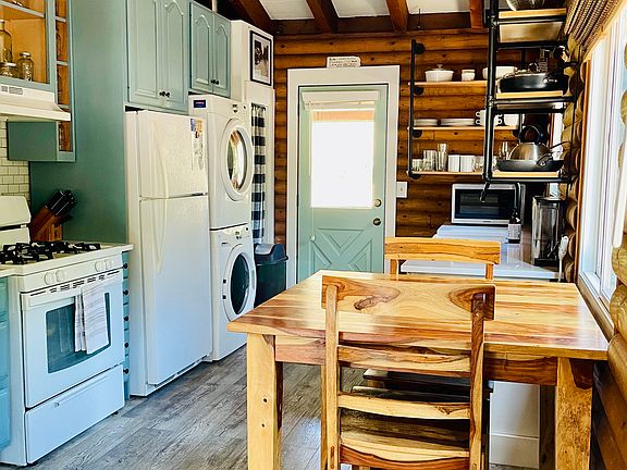 Upgraded log cabinHeated bathroom floorsWood burning stoveTons of natural lightLarge corner lotGas ovenBear box