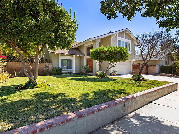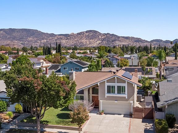 Just in time for the Holidays, don't miss this fabulous 2,115 sq ft, two-story pool home, nestled in the highly desirable Oakcrest neighborhood in East Simi Valley.Step through the beautiful oak and leaded glass door entry, into an elegant foyer, which sets the tone for generous size rooms and, picturesque views from almost every window!An impressive formal living room with vaulted ceilings, recessed lighting, warm hardwood floors, and a custom marble fireplace, flows through to an open- plan kitchen dining area, with tile flooring and a family room attached, it's the perfect place to entertain family and friends! Beautiful picture windows and sliding doors open to the lush private backyard oasis, with a sparkling pool & spa, covered patio area, and a wonderful array of fruit trees including; pomegranate, oranges, lemon, lime, passion fruit, grape vines and blackberry vines!Remodeled kitchen, with granite counters, custom backsplash, stainless steel appliances, and recessed lighting throughout , plus a pass-through window for easy entertaining in your beautiful backyard! A large ground floor powder room, and lots of storage space, are the perfect addition to this home's lower level. The upper level offers ; 4 bedrooms and 2 bathrooms, with stunning views of the Simi hillsides from every room! The impressively large primary suite has room to lounge and take in those views, with ensuite bathroom and large closets too!Additional features include; Energy efficient paid off TESLA SOLAR, newer roof, newer HVAC, newer Anlin dual pane windows throughout, new raised panel doors, fresh paint throughout the interior,recently painted exterior...and so much more!Large 2 car garage, RV parking, and mature landscaping front and back.Just minutes from award winning schools, parks, shopping, dining and easy access to the 118 fwy, this home has everything you've been looking for. Quite simply a MUST SEE!