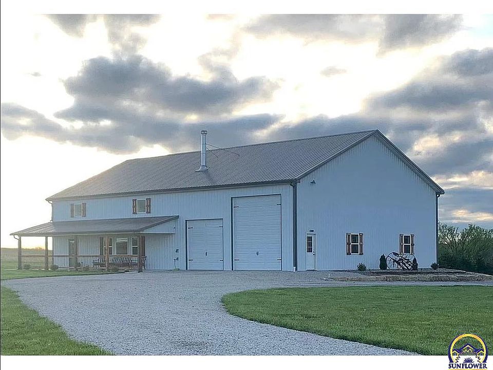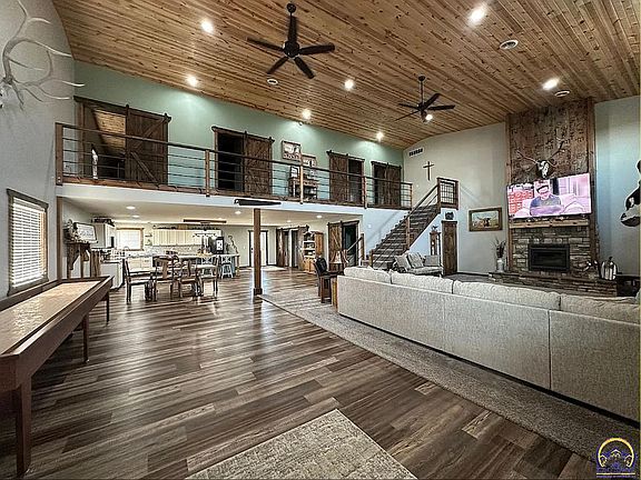 This beautiful barndominium setting on 76.8 acres on blacktop has much to offer. The home has vaulted ceilings with 3 bedrooms and 1 full bath loft overlooking the living room area. The main level has a large open concept layout including a living room, large kitchen with an island, walk-in pantry, a large laundry/Mud room, a full bath and storage under the stairs. This home has central heat and air with a beautiful floor-to-ceiling wood-burning fireplace and built-in blower. Attached is a pull-through 4-car garage with 4 doors with 1 bay with 14ft doors, perfect for RV’s, campers, or anything else you can fit. The storm shelter is also in the garage right outside the laundry/mud room. There is a small shed out back along with a beautiful grain bin gazebo and above-ground pool. The land has 2 ponds and timber with a creek running through it. The land is perfect for many things including hay ground and pasture with plenty of wildlife for hunting, and ponds full of fish.