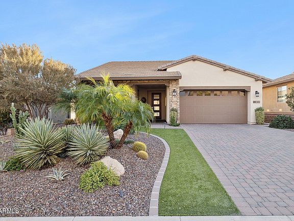 Embrace Luxurious Resort Living at Trilogy at Verde River! Discover the elegance of the Juniper floor plan, perfectly situated on an oversized lot with breathtaking desert views and Four Peaks views. The home boasts attractive curb appeal with stone-accented pillars, a cozy porch, and a professionally designed desert landscape. Step inside to a stunning interior that features timeless wood-look flooring throughout, leading to a spacious great room with an accent wall and captivating outdoor views. Expanded multi-slide patio doors seamlessly integrate indoor and outdoor living. The immaculate kitchen is a chef's delight, featuring recessed lighting, granite countertops, a stylish tile backsplash, stainless steel GE Monogram appliances, ample wooden cabinetry, an island and a walk-in pantry for additional storage. Retreat to the primary suite, where abundant natural light enhances a lavish ensuite complete with dual granite sinks, a designer tile shower, and a custom walk-in closet system. Your private outdoor oasis is perfect for entertaining, with a covered patio offering a built-in BBQ, breathtaking mountain views, an exterior fireplace, and synthetic turf.