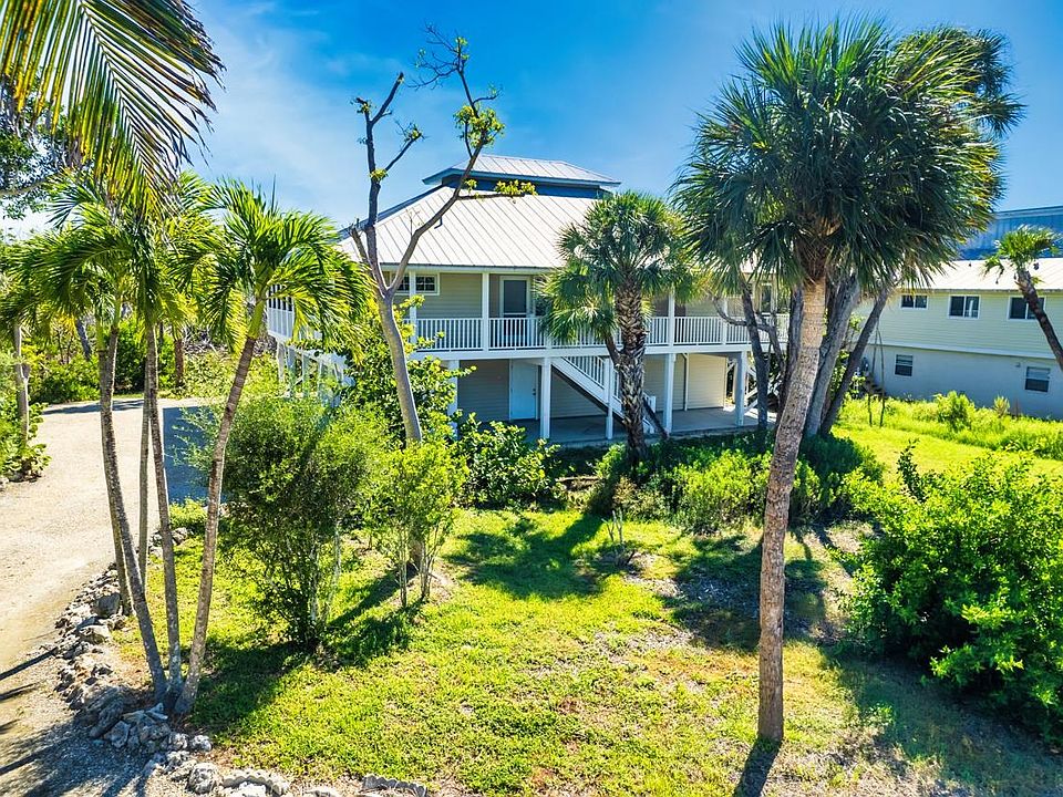 Located on Sanibel’s quiet west end, just a short walk or bike ride to Bowman’s Beach, this Old Florida style 2BR/2BA home sits on a 1.35-acre double lot with sanctuary views and wildlife. Inside are volume ceilings with wood accents, an open kitchen with island and passthrough window, and a layout that provides privacy to the primary suite with a separate hallway door. Sliders from the great room, primary, and guest bedrooms open to a large screened deck that connects with a wraparound porch, and an outdoor open deck ideal for grilling, entertaining, or relaxing outdoors. The ground level offers a two-car garage with abundant storage and workshop space. Lower level garage doors open to the front of property and rear to the backyard and a versatile covered patio. Updates include new electrical, AC, and garage doors. Ready to enjoy as-is or update to your style, this property offers excellent potential in one of Sanibel’s most desirable locations.