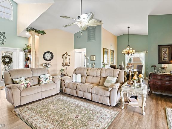 Welcome to this lovingly maintained 2 bed, 2 bath home in the sought-after 55+ gated community of Sabal Springs Golf & Racquet Club! Enjoy wide open golf course views from your extended tiled lanai, complete with string lighting—perfect for relaxing or entertaining. The interior features vaulted ceilings, rich wood-style tile flooring in the living area, and a spacious kitchen with granite countertops, stainless steel appliances, solid wood cabinetry, and a large island. The sunny breakfast nook is framed by bay windows that overlook the beautifully landscaped yard. The inviting primary suite includes plush carpet, peaceful green tones, private lanai access, and an ensuite bath with dual sinks, soaking tub, and separate shower. The guest room offers flexibility with a built-in Murphy bed and extra storage. Other highlights include a 2-car garage, indoor laundry, hurricane shutters, and custom touches throughout. HOA fee includes lawn care, basic cable and high-speed internet, exterior painting every 7 years, and 24/7 gated security. Sabal Springs is an amenity-rich community offering golf, tennis, pickleball, a heated pool and spa, clubhouse with restaurant and bar, fitness center, and year-round activities. Conveniently located near shopping, dining, I-75, RSW airport, and local beaches. This home truly has it all!