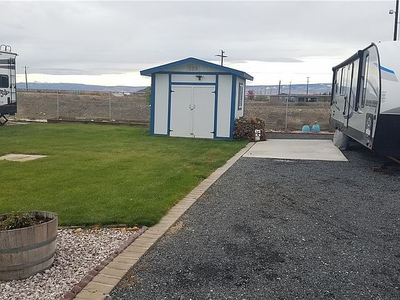 Private lot with Utility shed. and graveled parking area. Water, electric and sewer on lot. Trailer is available for purchase separately, not included in this pricing. HOA dues are $1000.00 per year Include water, sewer, garbage, common area maintenance. Swimming pool and hot tub. Bring your RV or purchase the one on site. Community located on golf course and close to fishing lakes, hunting and Columbia River. And several great wineries.