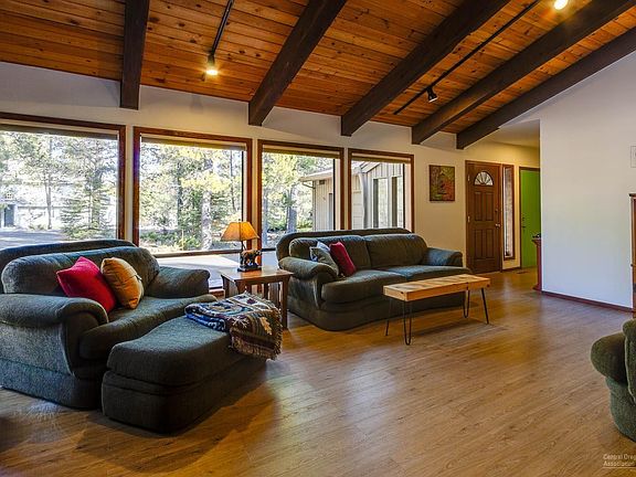 Centrally located, single level, home close to all Sunriver Resort amenities! This ranch style, rustic home has wood beam vaulted ceilings and floor to ceiling rock fireplace in the great room, newly painted cabinetry, stainless steel appliances, built in desk in guest bedroom, skylight in master bathroom, new wood laminate floors throughout, nice private deck, Hot tub and sunroom that over looks the private common area! Spacious lot, double car garage, A/C. All this ready for you to enjoy!