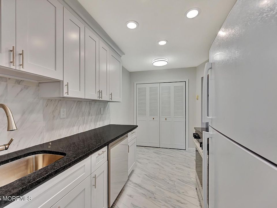 The condo features a white kitchen with granite countertops, a nice backsplash, and quality appliances. Hardwood floors and updated light fixtures add a warm touch throughout. The bathroom includes a modern vanity and tile work. Conveniently located just steps from the NYC bus with golf course views. Enjoy great community amenities including a clubhouse, pool, and tennis courts, close to shopping and transportation.