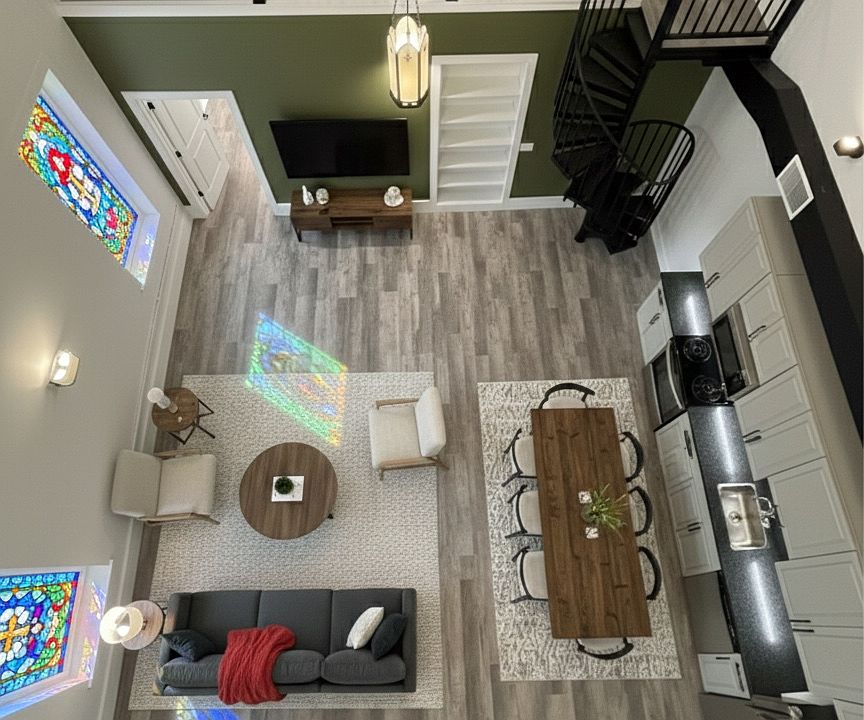 The heart of the home is the 800-square-foot Great Room, a space of cathedral-like proportions defined by two breathtaking 20-foot original stained-glass windows. These are not merely windows; they are living works of art that bathe the interior in a kaleidoscopic glow.