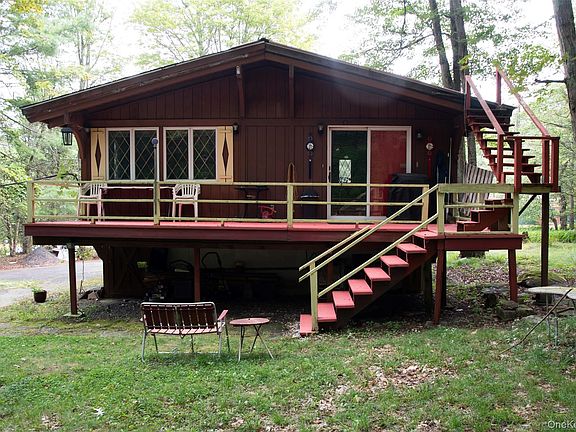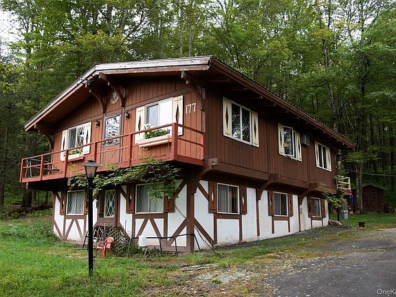 Built in 1964, this distinctive Swiss chalet-style home showcases timeless cedar craftsmanship and modern comfort with 3 bedrooms, 2 bathrooms, and approximately 1,680 sq ft of living space on a 0.34-acre lot at an elevation of 2,100 feet in the Sullivan Catskills. The upper level offers vaulted ceilings, a spacious living room that opens to a balcony, a dining area, kitchen, and a primary suite with private bath, while the lower level includes two additional bedrooms, a full bath, and storage with ceramic tile beneath the carpet. An unfinished basement allows room for customization, and exterior highlights include a large deck, detached two-car garage with storage and laundry space, and a durable metal roof. Systems feature a heat pump with electric and oil, two wall split cooling units, and included appliances such as a washer, dryer, refrigerator, dishwasher, and freezer. This property blends character, practicality, and lasting quality in a scenic Catskills setting—schedule your showing today to see it for yourself.